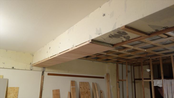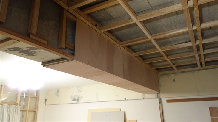 梁の和室側と梁下に板貼り付けるラワン合板の下地作業。タチカワブラインド用の下地ラワン合板の幅寸法348mmに決定。高さ調整とさらなる補強を行い合板取付を明日行いたい。