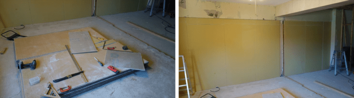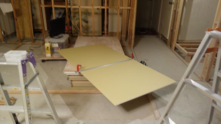 今回初めて石膏ボードを張り付けました。ラワン合板と石膏ボードの継ぎ目合わせを心配していましたが、なんとなくうまくいきました。本日は18時30分に作業終了です。