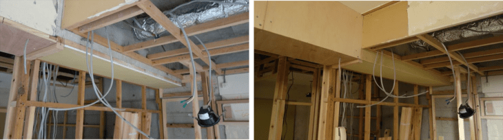 本日の電気工事は梁下にダクトレールを設置するための配線作業を行いました。