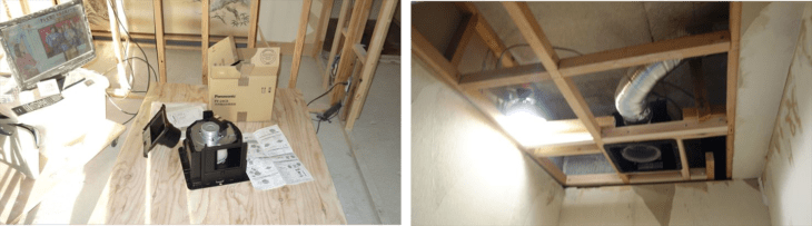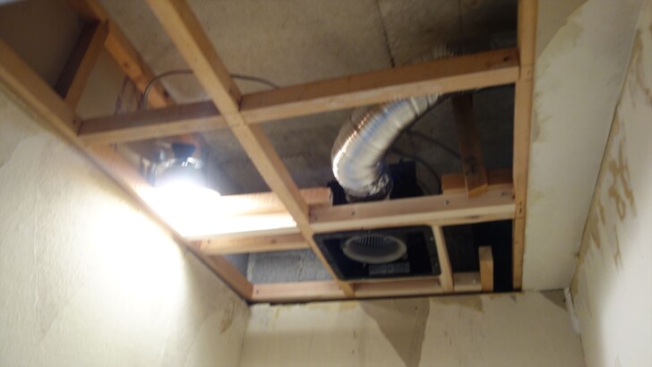 トイレ天井に換気扇を取り付けました。アルミダクトの方向と長さを調節して換気扇に接続するのが重要な作業。天井に石膏ボードをはることが出来るところまでの作業で午前中終了。