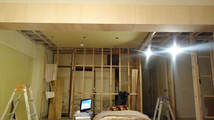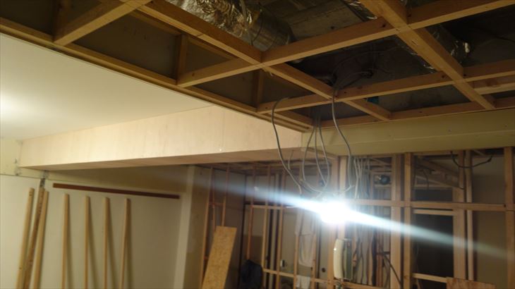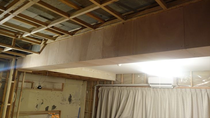 ラワン合板で梁下と和室側の下地作業完了。結構難しい部分を完了出来たのは大きい。19時に本日作業終了しました。