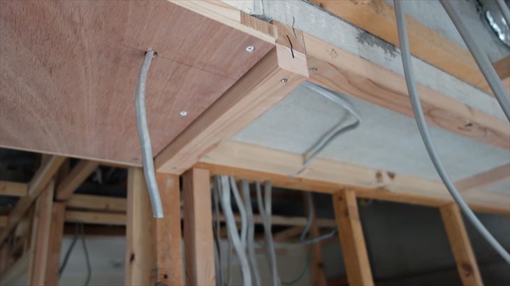 5.5mmのラワン合板をホームセンターで購入、切断してもらい梁に直接固定。接着とネジ止めの併用を予定していましたが、梁に直接ネジ止めだけでも大丈夫そうだったので接着は無し。