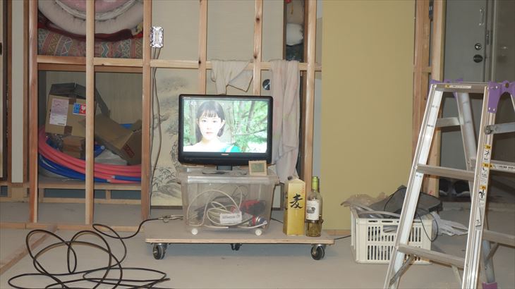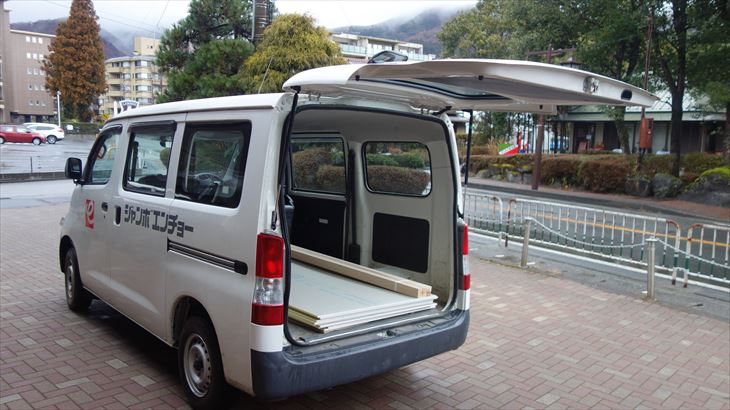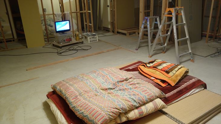 朝一番で作業場兼寝床の位置を変更し、ベットタイプにしました。佐藤設備さんが来るまでに昨日考えた仮押さえ方式を実験。これがとてもうまく出来ました。我ながらナイスアイデアです。
