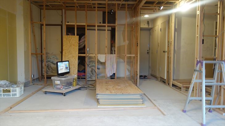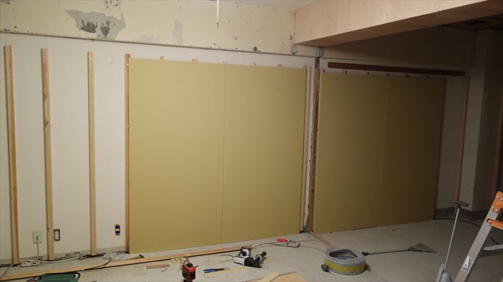 きょうからエコカラットを設置する壁の造作作業。1日で終える予定でしたが、残念・・・・