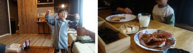 マンションではカーテンを閉めていると真っ暗で時間感覚が無くなります。利太朗くんが起きたのは8時頃、ゆっくり寝れたかな。朝ご飯は相原精肉店で昨日購入したローストビーフとハンバーグのホットサンド、とっても美味しいです。