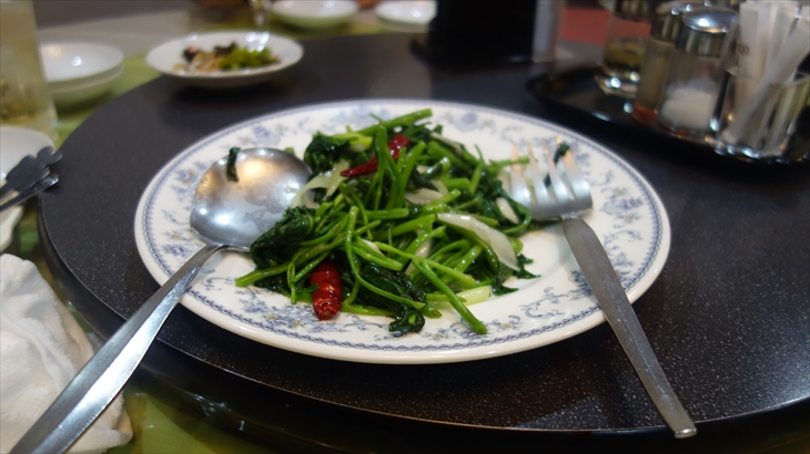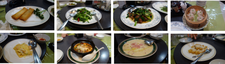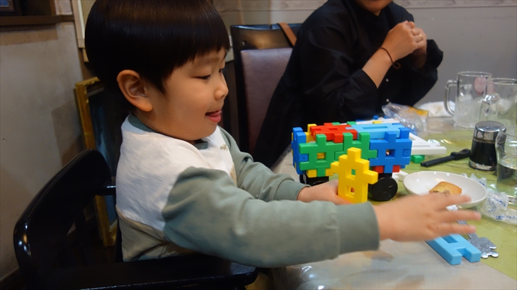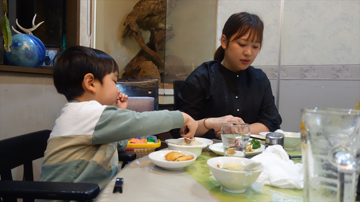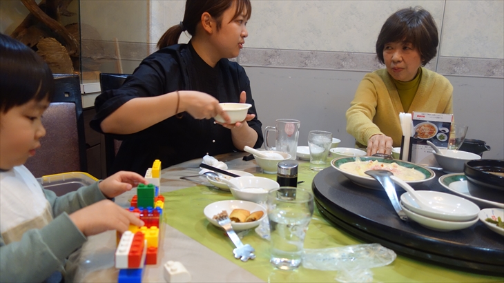 飲み物はそれぞれお好みで注文。空芯菜・レバニラ・春巻き・シュウマイ・麻婆豆腐・白菜のクリーム煮・デザートを注文し、約2時間夕食を楽しみました。利太朗くんはお店にあったブロックで大人しくニコニコしてあそんでいました。