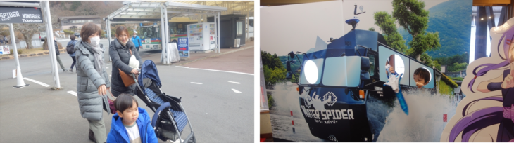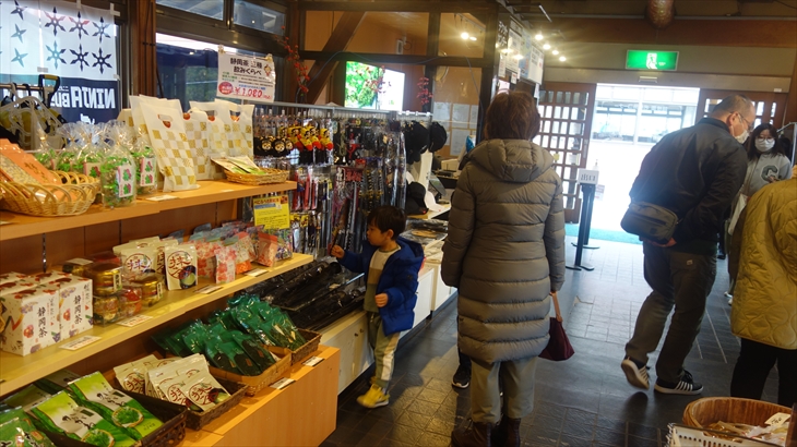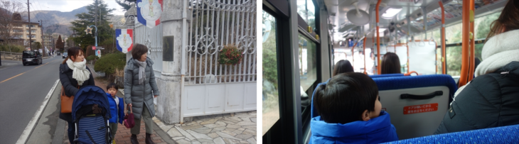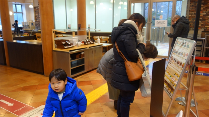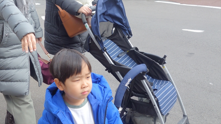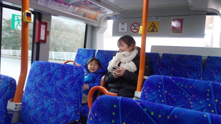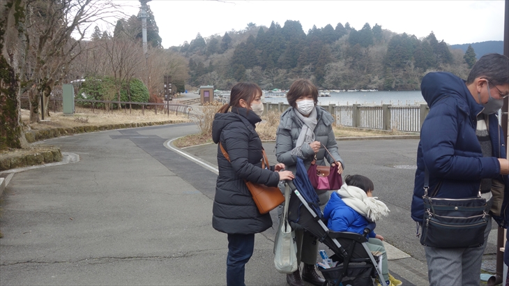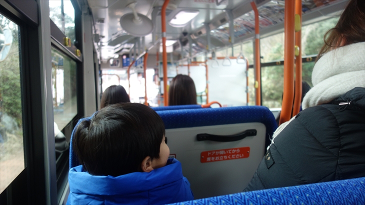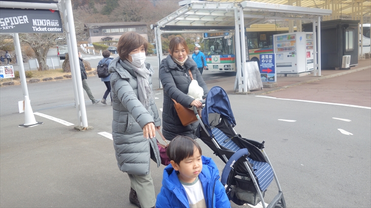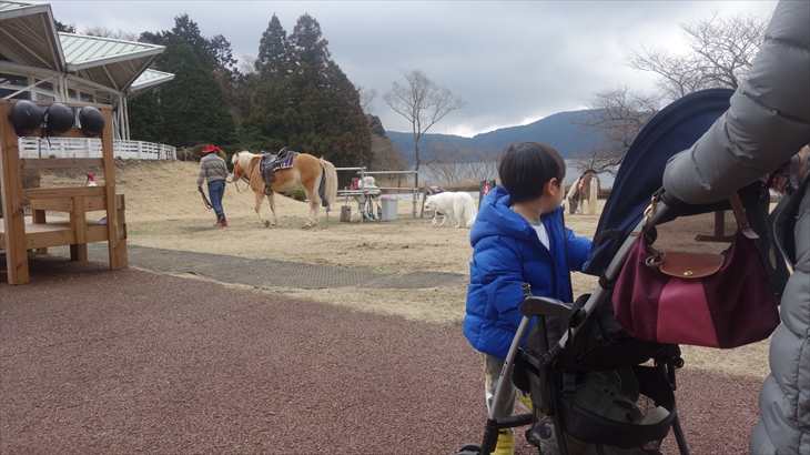 湖畔の方に歩いていく途中にのポニー乗り場で利太郎くんの意向を確認したところ怖いようです。水陸両用の忍者バスに乘りたいと言ってたので、チケット売り場で確認すると大人1名2400円、全員で1万円コースになり寒そうなこともあり作戦変更です。