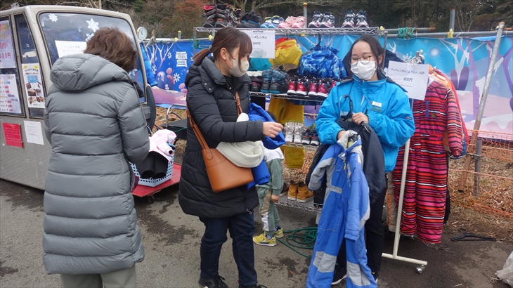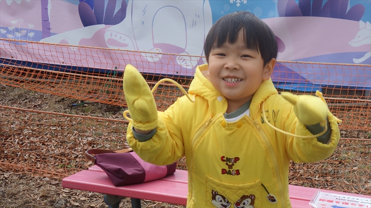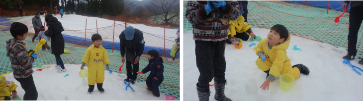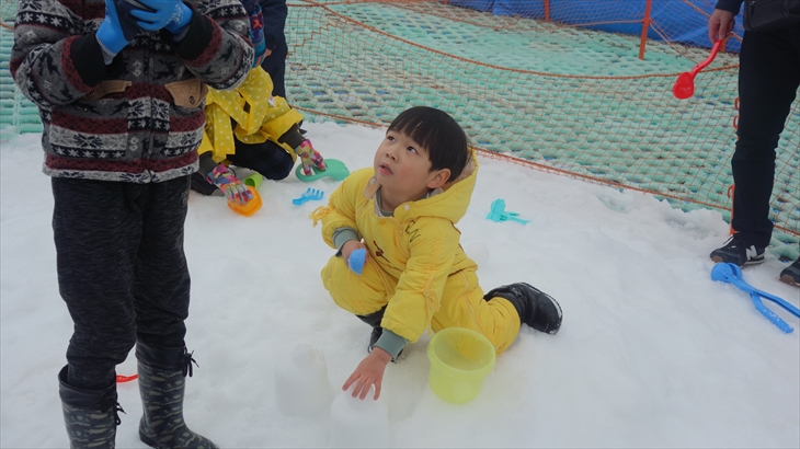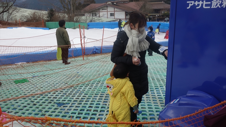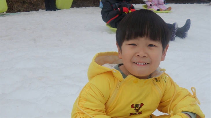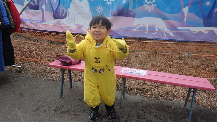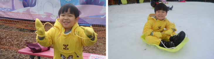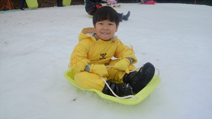 箱根園の有名アトラクションの雪ソリは2時間800円/名とお手軽で楽しそう。黄色いジャケットに着替え初めての雪ソリに挑戦する利太朗くん、意外と滑ることができました。