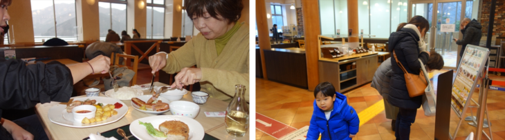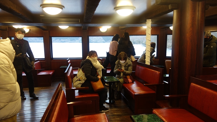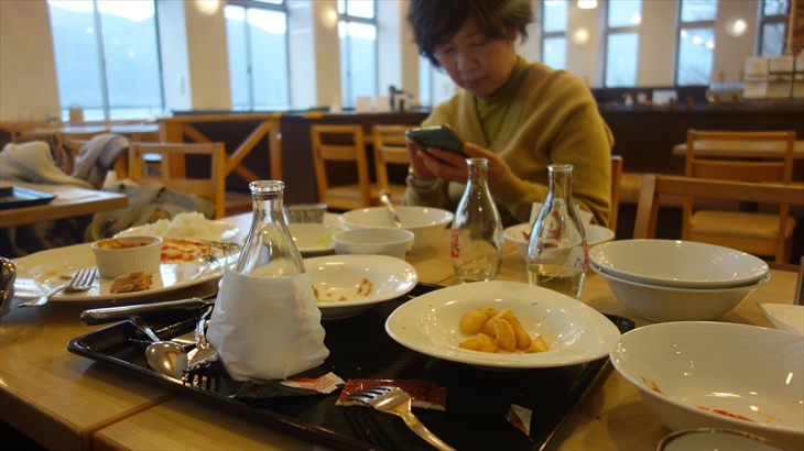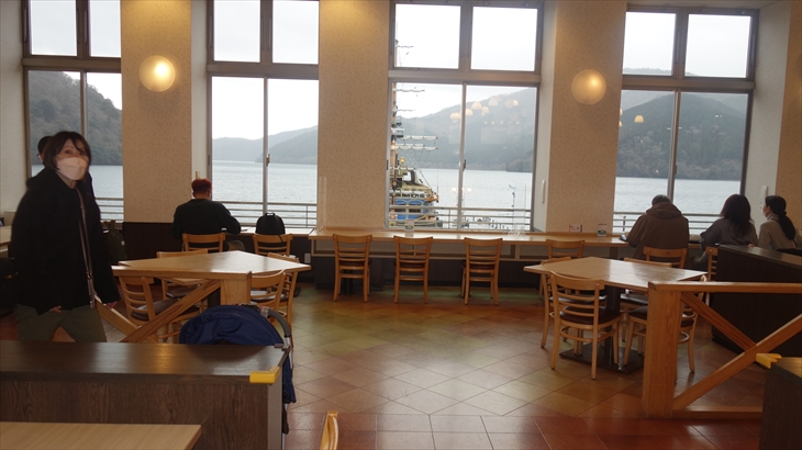 約30分の船旅を終えたのは14時40分。雪がチラつき始め、桃源台ターミナルのベンチで急遽ランチ変更検討。結果この施設にあるビューレストランで軽食&休憩することにしました。とても空いていて、綺麗で景色が良く、この選択は大正解でした。