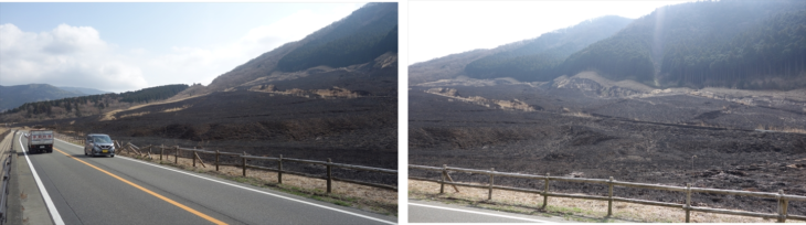 翌日の散歩は穂し乃庵方面から、9時52分にその交差点に到着。真っ黒焦げになったすすき高原、これも絶景です。昨日通行止めだった歩道をゆっくりと歩きました。すすきが無くなり見晴らしが良くなった高原は、いつもと違った景観を楽しませてくれました。