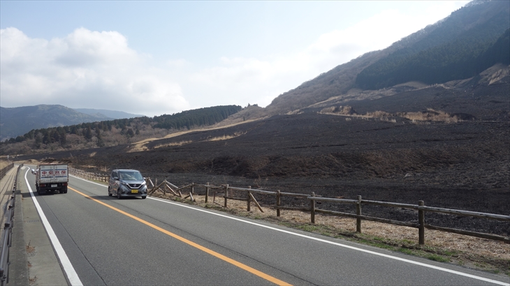 翌日の散歩は穂し乃庵方面から、9時52分にその交差点に到着。真っ黒焦げになったすすき高原、これも絶景です。昨日通行止めだった歩道をゆっくりと歩きました。すすきが無くなり見晴らしが良くなった高原は、いつもと違った景観を楽しませてくれました。