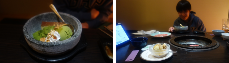 ライスを食べ終わるとトシ君は石焼ビビンバ、私は普通のビビンバを注文し、お肉もカルビとロースを何度か注文してお腹一杯食べました。20時ころデザートを頂き約2時間弱の焼肉夕食が終わりました。