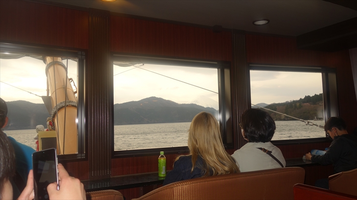 海賊船の特別席は外国の観光客でほぼ満席、1つだけ空いている席を見つけ座ることができました。元箱根で約3割くらいのお客さんが降りましたが、ここから乗り込む方もいて満席状態は続きます。2月に乗った時と大きく違いました。
