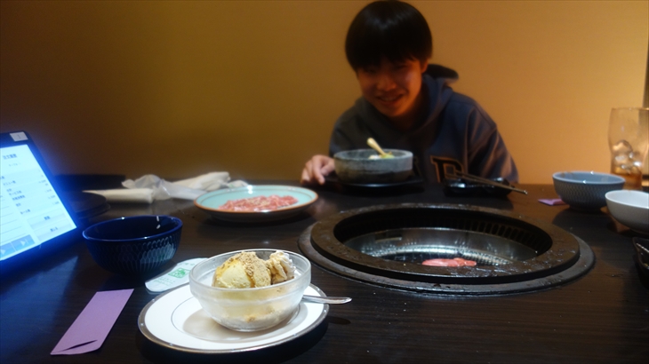 ライスを食べ終わるとトシ君は石焼ビビンバ、私は普通のビビンバを注文し、お肉もカルビとロースを何度か注文してお腹一杯食べました。20時ころデザートを頂き約2時間弱の焼肉夕食が終わりました。