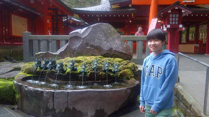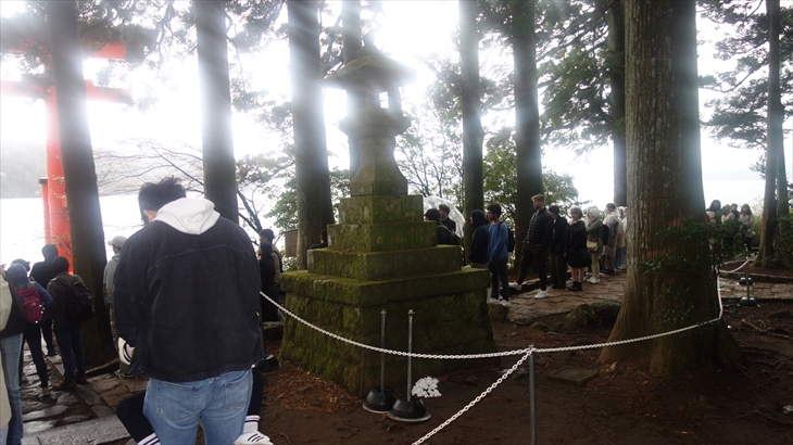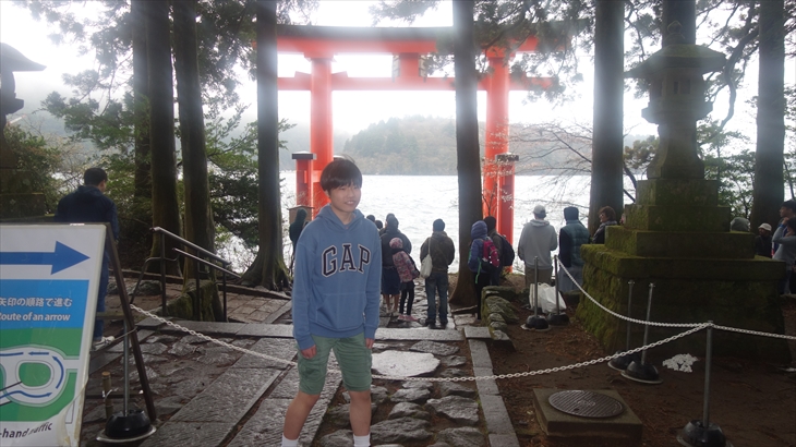 お天気も少し雨降り、車で箱根神社に行きました。トシ君の高校入学をお願いして、湖の上に浮いてる鳥居の前で記念撮影。ここは有名な撮影スポットらしく沢山の外国の方の行列がありました。