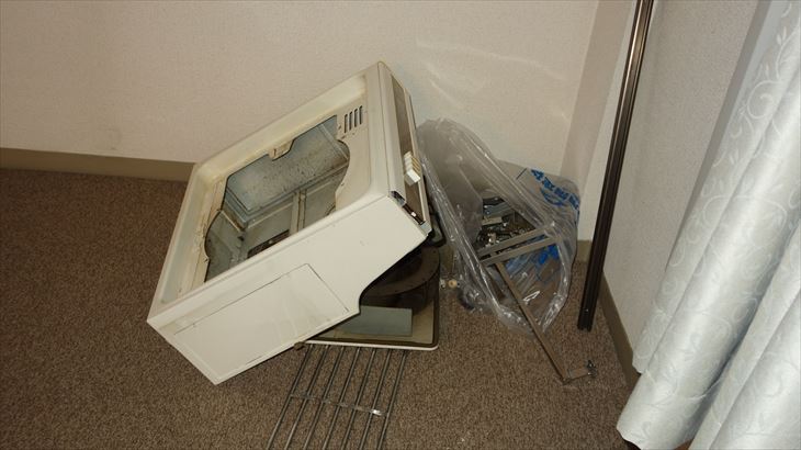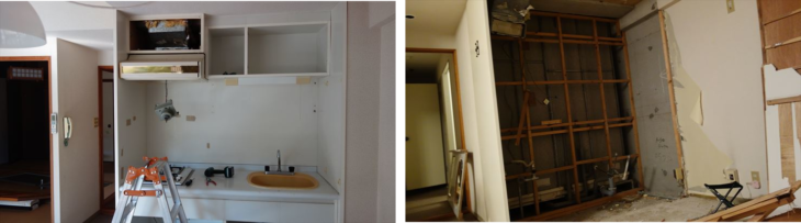 キッチンは造作で作られていたようです。上の棚、下の棚も造作なのでがっちり固定されているので解体は力づくで行いました。