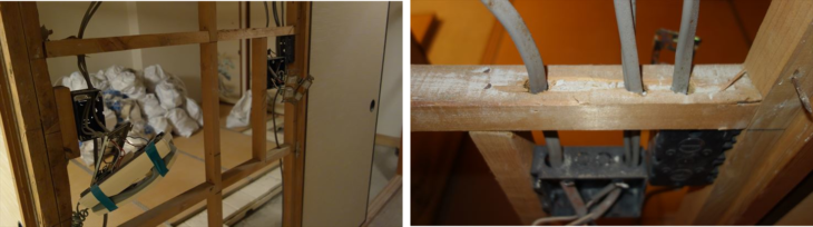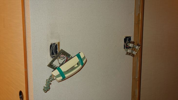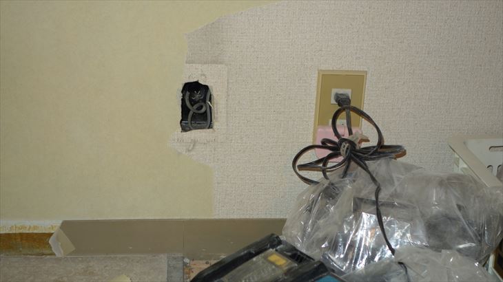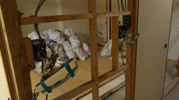 撤去予定の壁に取り付けられているスイッチ類のケーブルが材木に丸穴を開けて配線されています。丸穴まで切断するのは大変そうなので一端ケーブル接続をスイッチから外してケーブルを抜く方法で明日行うことにしました。