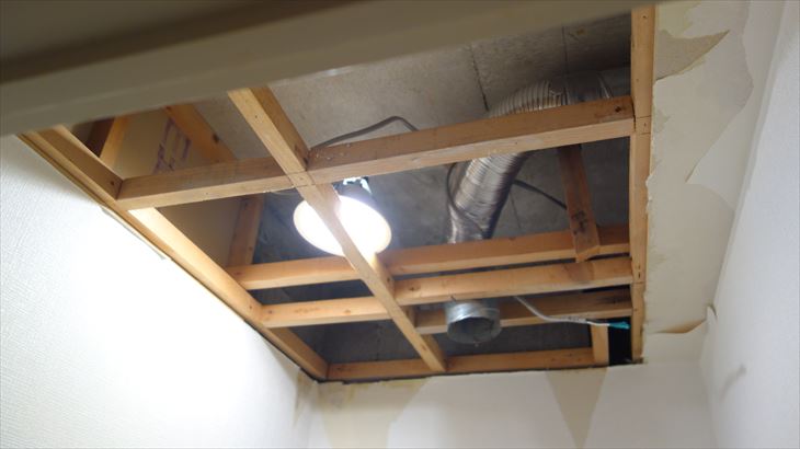 トイレの換気扇が壊れているので交換するためには天井を解体しなければなりません。石膏ボードの解体なので約1時間程度で完了です。