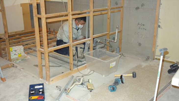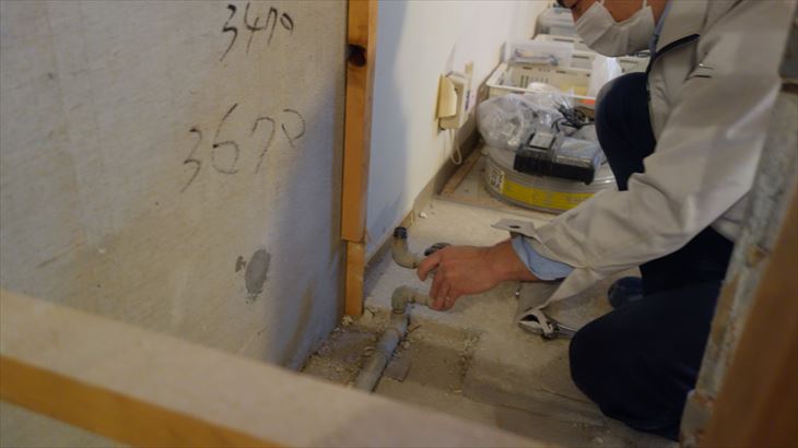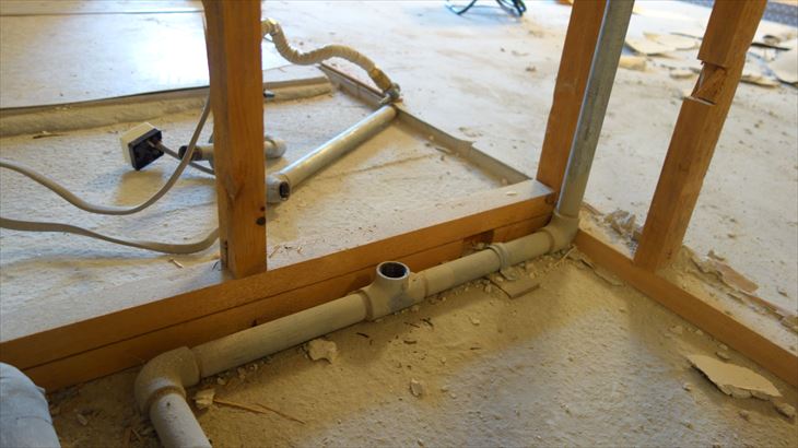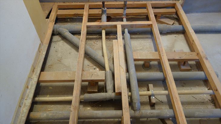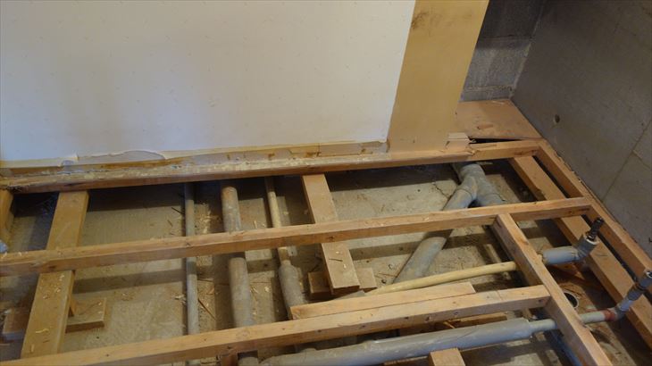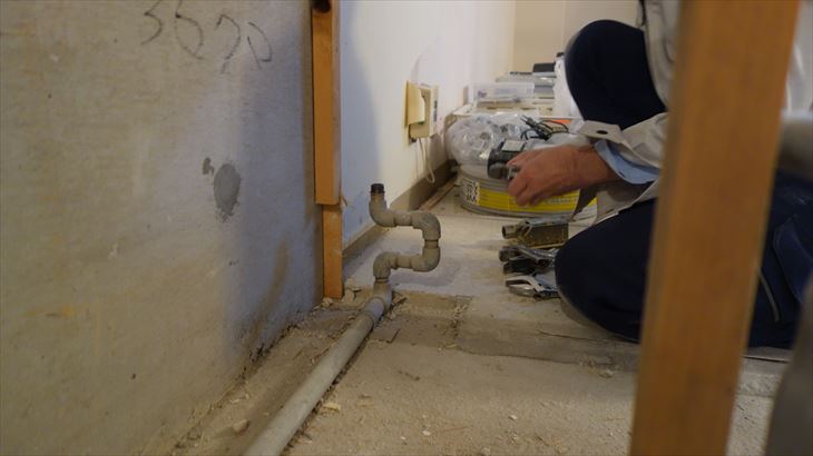 先週、洗面所の合板を撤去し配管が見えるようになりましたが、排水管が奥側で分岐しており、分岐元で切断する可能性があるので約50cmの幅で残っていた合板を解体しました。地道に手前側の釘を外し、丸鋸で切断しました。