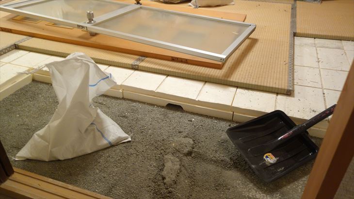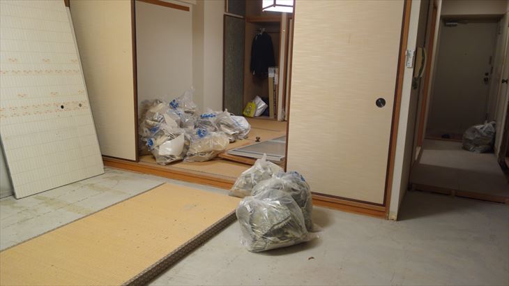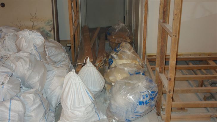 和室壁の石膏ボードの解体を開始しました。そんなに時間はかからないと思っていましたが、土嚢詰め込みと掃除に結構時間がかかりました。