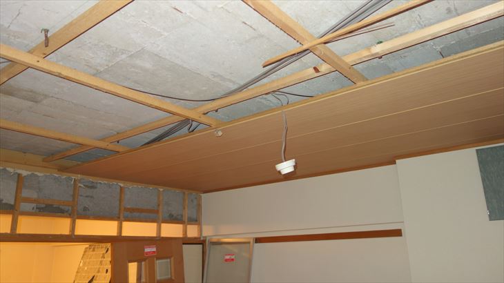 クロゼット用の壁を造作するためには天井の構造を確認補強する必要があったので、天井の解体に踏み切りました。薄い化粧ベニア板だったので簡単に剥がせました。