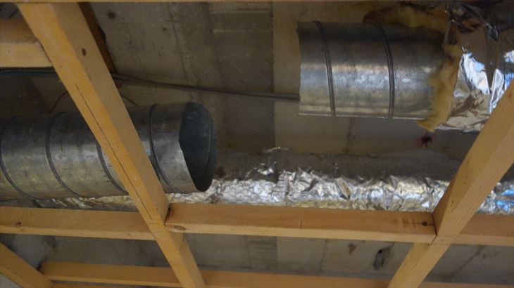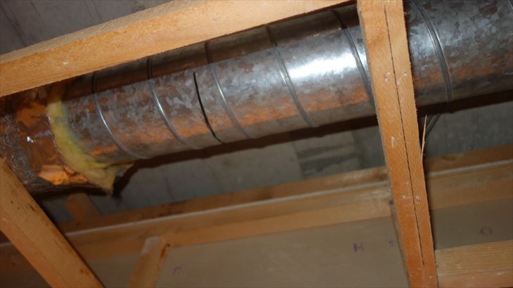 キッチン天井裏の排管ダクトのルート確保のためには直径150mmの排管ダクトをサンダーで火花パチパチで切断しました。