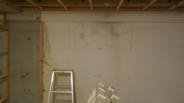 キッチン取付概要や洗面所、洗濯機、シャワー室の給排水の位置を壁に書き込みました。キッチン側の天井高さは2100cmと低くなっています。ラクエラ標準高さは2360cm、260cm足りません。