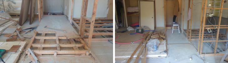 私は廊下の床撤去、合板はしっかりと固定されているので丸鋸で細かく切断しながらの解体。廃棄のために解体した木材の釘抜きなどを午前中行いました。
