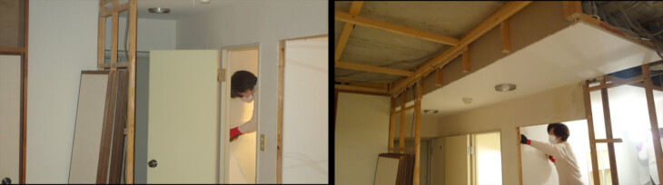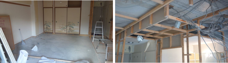 本日最初の作業は残っていた畳2枚の撤去とジャリ処理。9時45分ころから廊下天井の石膏ボードは剥がしを行いました。