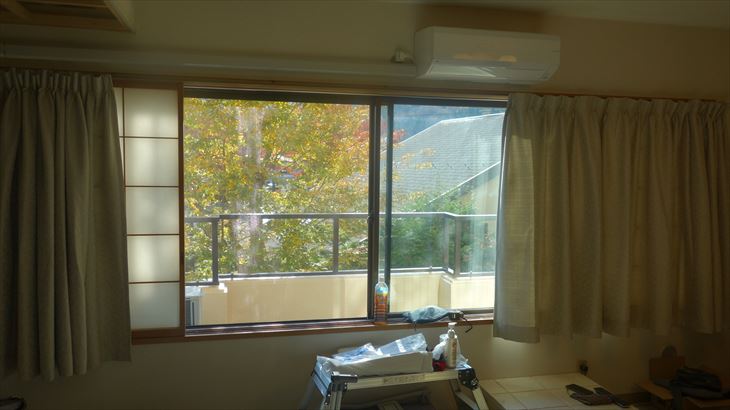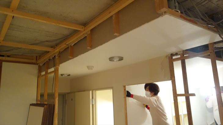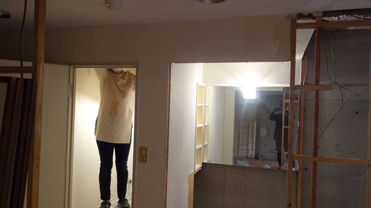律子さん、壁紙はがし頑張ってくれています。石膏ボードの壁紙はがしは比較的簡単ですが、梁などのコンクリートに貼られた壁紙は剥がしにくく苦戦。