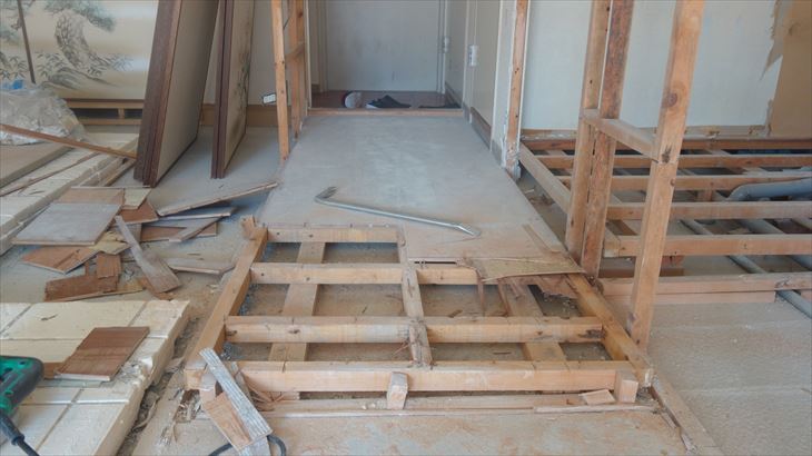 私は廊下の床撤去、合板はしっかりと固定されているので丸鋸で細かく切断しながらの解体。廃棄のために解体した木材の釘抜きなどを午前中行いました。