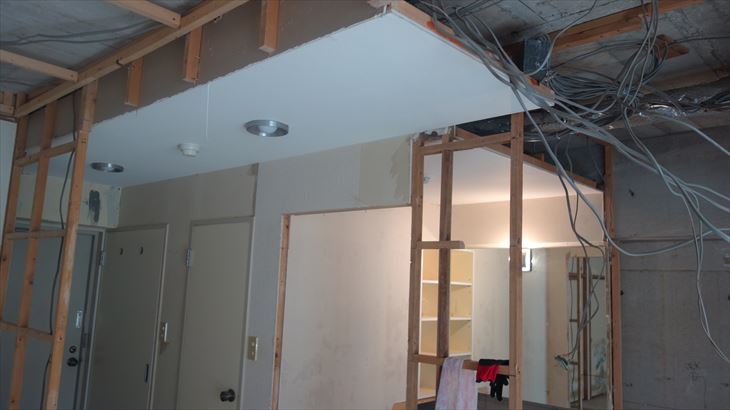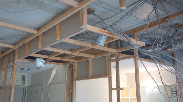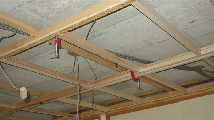 天井固定する石膏ボードの大きさ(1820×910)を考慮して位置だしを行い、現物合わせで材料をカット予想以上に時間がかかります。寸法を測るのは一人だと大変。いつのまにか21時になってしましました。