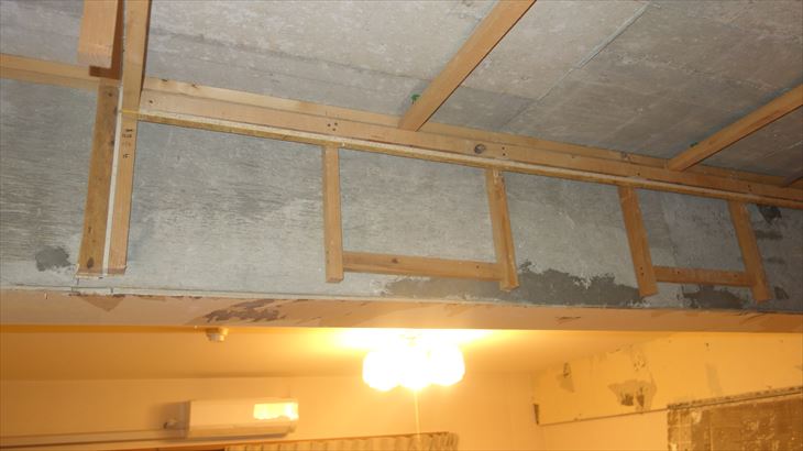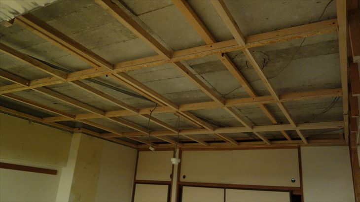 室内で作業できたのは17時ころ、和室天井に石膏ボードは貼り付けするために下地材1本の取付を初めて行いました。こらは解体以外の初めての作業です。