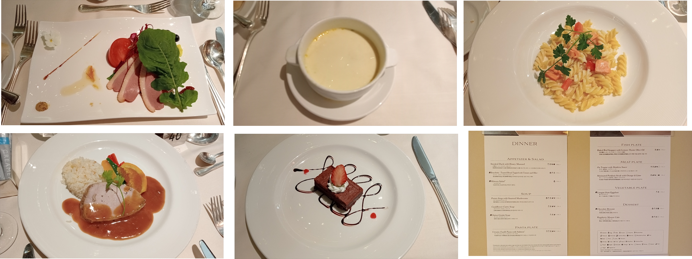 ショータイムの後は、14階で調達したおつまみをテイクアウトし部屋でワイン。3日間同じメニューの洋食コースを本日も頂きました。
