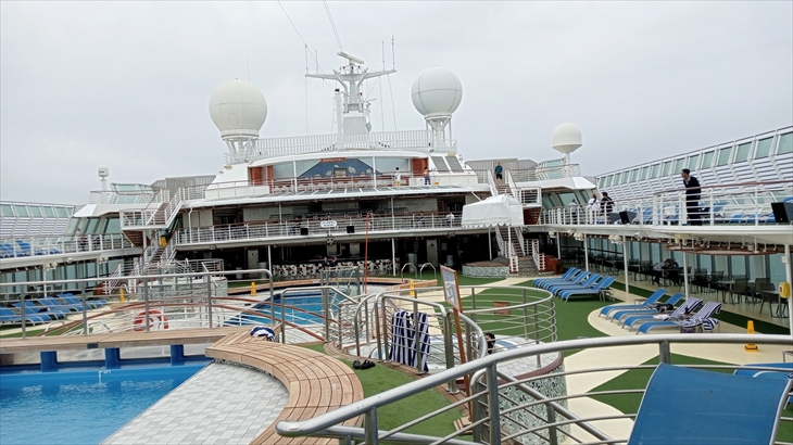 2025年4月25日(金)3日目の朝のお天気は曇り、四国と九州の間の海の上で陸地は見えません。10時ころ鹿児島沖合を航行中、wifiが不安定になってきました。野外プールのある14階を探検してみました。