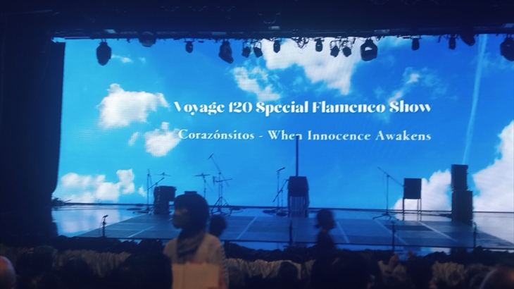 15時から7階のプリンセスシアター(船先)で45分間開催される「120th出航記念特別フラメンコショー」を見に行きました。30分前でしたが大行列、おかげ様で前から6番目の正面席に座れ特等席で本物のフラメンコショーを楽しみました。