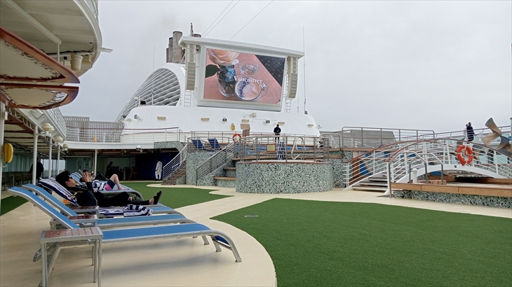 2025年4月25日(金)3日目の朝のお天気は曇り、四国と九州の間の海の上で陸地は見えません。10時ころ鹿児島沖合を航行中、wifiが不安定になってきました。野外プールのある14階を探検してみました。