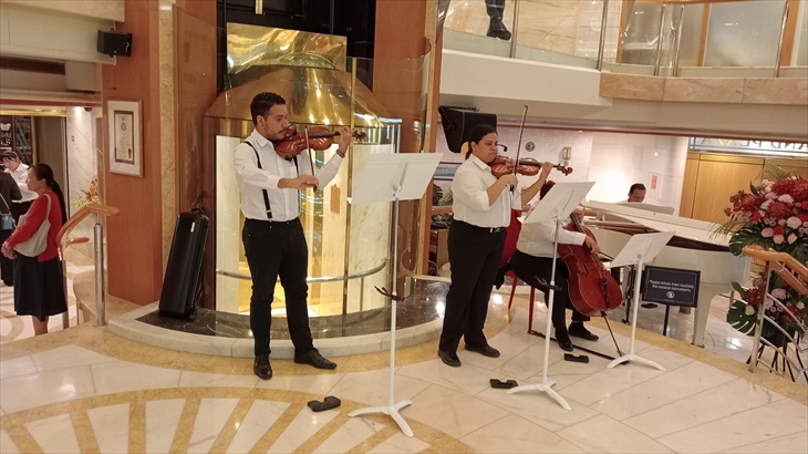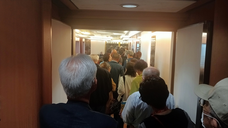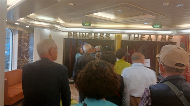 15時から7階のプリンセスシアター(船先)で45分間開催される「120th出航記念特別フラメンコショー」を見に行きました。30分前でしたが大行列、おかげ様で前から6番目の正面席に座れ特等席で本物のフラメンコショーを楽しみました。