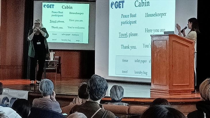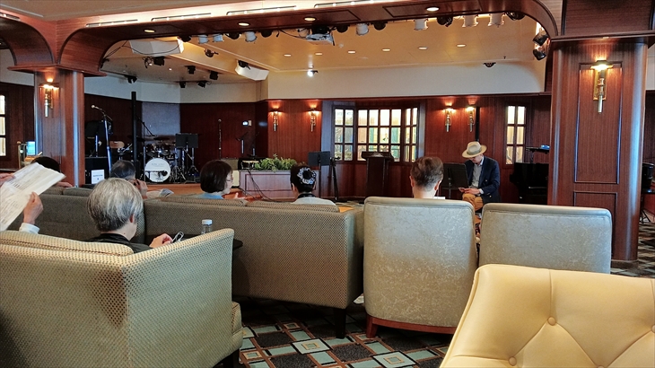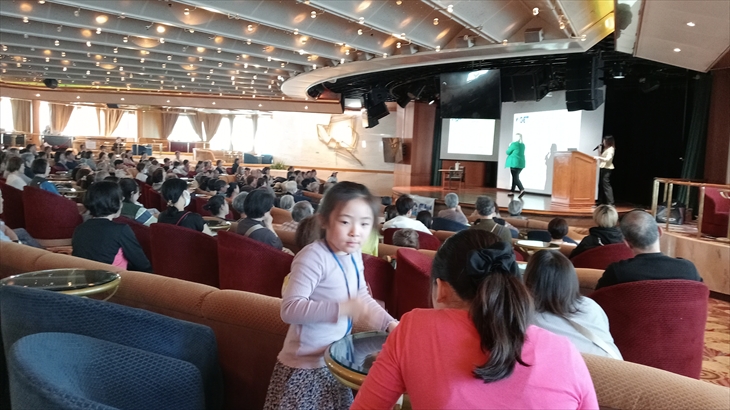9時から7階のホイールハウスバーでピースボートスタッフ田中洋介さんの「船内新聞の見方とおすすめイベント紹介」に参加し、本日のお勧めイベントの確認を行いました。
