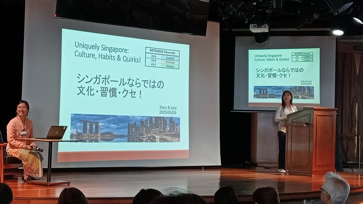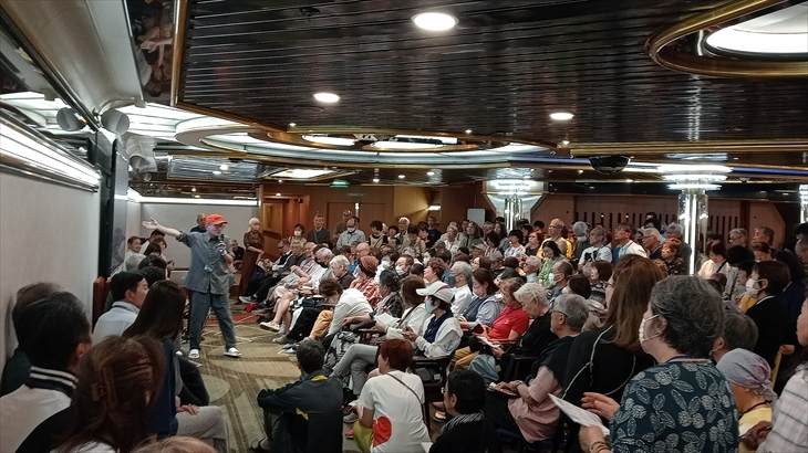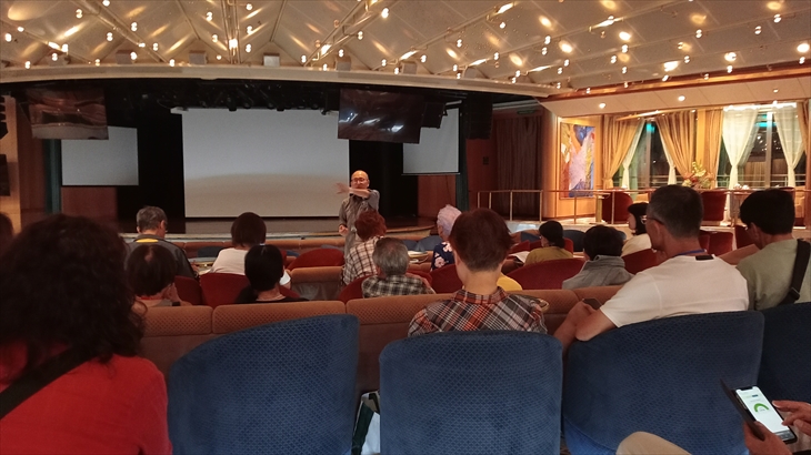 ピースボートスタッフが主催する「シンガポールならではの文化・習慣・くせ!」が7階ビスタラウンジで開催されました。他民族国家のシンガポールの方は、歩くのが早く、エレベータも早く、行列が好きだそうです。ホーカ文化があり食堂では席確保のためにティッシュを置いてから食べ物を買いに行くようです。また、あと片付けをしないで放置すると罰金$300らしいです。