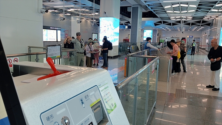地下鉄の改札仕組みを理解していなかったのでコインで入場して間違えて出口でコイン投入していまい振り出しとなりました。もう一度、切符(コイン)を購入するために約15分程行列に参加して地下鉄に乗れたのは11時45分ころ、下船して1時間後です。ちなみに片道切符は4元/名(80円)なので買いなおした分も含め16元(320円)でした。