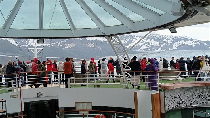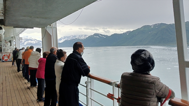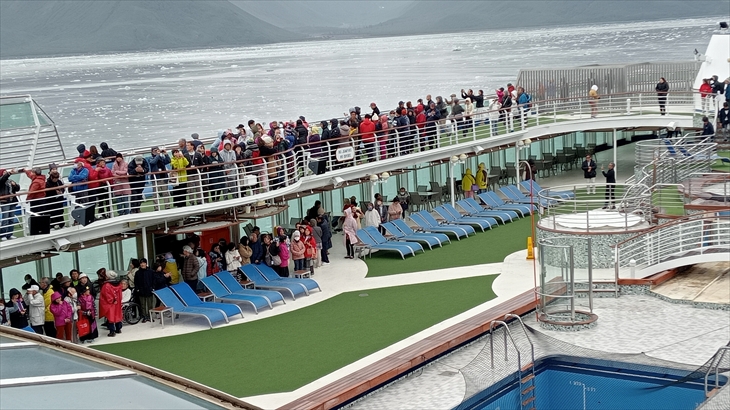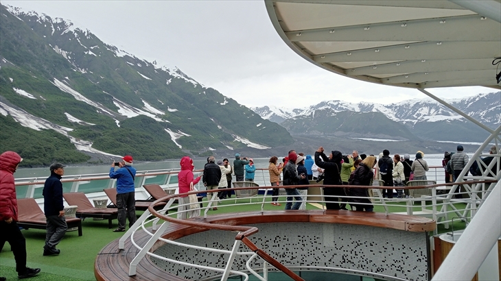 14階の船首に行くと人だかりです。目の前には長さ122m、幅11km、高さ180mのハバード氷河が横たわっていました。初めて目にする氷河の雄大さと景色に感動です。