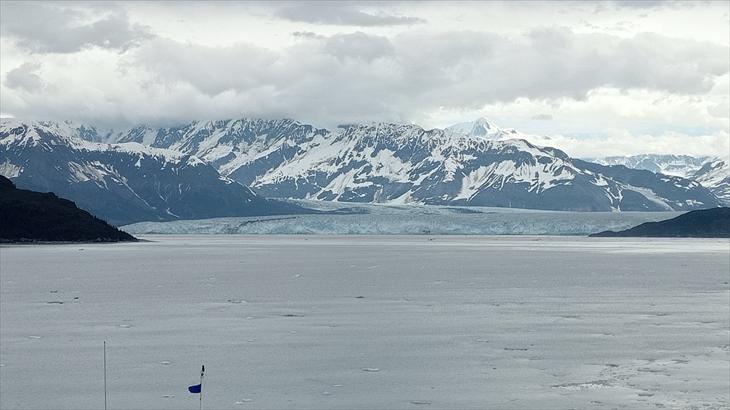 8時頃水先案内人の安藤さんから「船はハバード氷河の入口、ですが急ぐ必要はありません」と船内放送がありました。朝食を終え7階デッキに上がってみると、あっという間に景色が変わっていました。海面は細かい氷で覆われ、山々は筋状の白い氷河化粧です。周囲の方々も「とうとうアラスカに来たね~」と感慨ひとしお。うなずく私。
