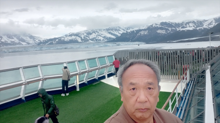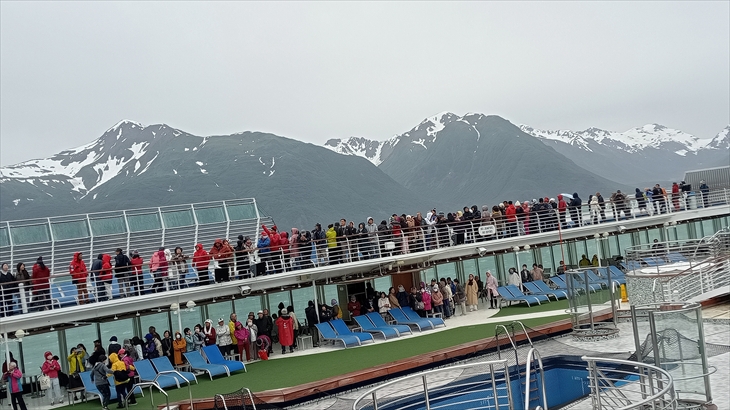 2025年7月26日(水)曇り時々小雨。今日から2日間のフィヨルド遊覧観光です。これから2日間、アラスカの専門家、水案の安藤さんがデッキより案内放送をしてくれます。初めて見る氷河と景色に感動です。