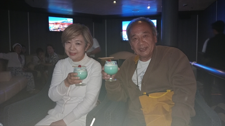 アラスカは沈まぬ太陽が空を照らし続ける白夜と、目の前に広がる氷河の白に魅了されています。ドレスコードは白で19時からホワイトナイトパーティが開催されました。V120Amigos仲間と一緒に氷河入りの特別カクテルで乾杯&ダンス。この船では毎日のように寄港地にちなんだお勧めカクテルが発売されます。コスパ最高、お勧めです。
