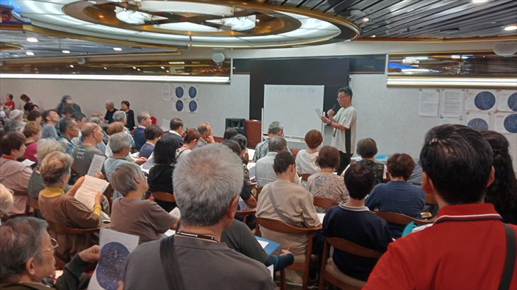 11時からピースボートで40年続く物資支援プロジェクト「UPA」のスタッフからの説明講座。毎クルーズで物資を直接手渡しで届けています。現地とのヒアリングで無駄のない物資の選択の上、乗客にも事前に物資依頼のリストが届いていました。災害地や貧困地の教育支援、楽器も多いようです。