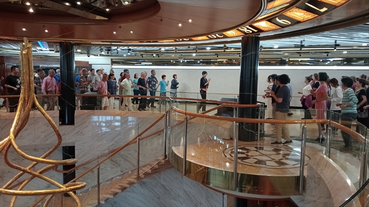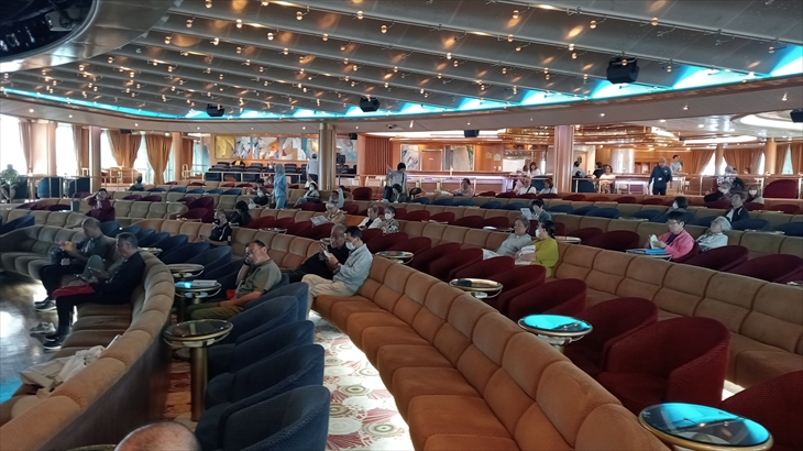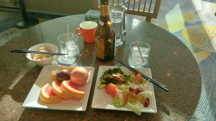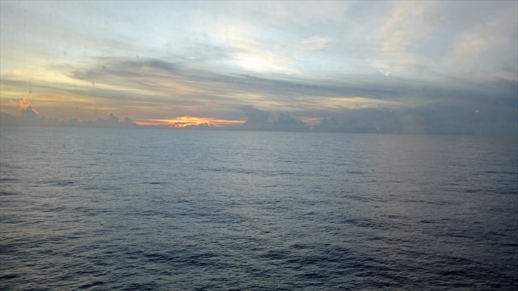 早めの夕食は14階レストラン。まだ明るいですが、赤道イベントの時に入れた焼酎ボトルを飲み干したので同じものを注文。不動産と株式投資で生計を立てているシニアの自慢話を聞きながら食事しました。ネタがグローバルは良いけれど、話が止まらない方の人助けでした。