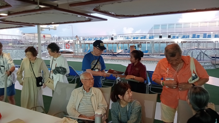 12階のリビエラプールのテーブルに飲みものを持参して集合、最初に自己紹介を行い、それぞれのグループで他愛のない話をしました。18時30分から約3時間ほど会は続きました。逗子葉山の「スズキヤ」のスーパーの創業者夫婦は常連で、ご一緒でした。あの方は日立製作所の元(副?)社長だよと教えてくれた人がいたけれど、皆似たおじいさんに見えてしまうので次会っても分かりません。