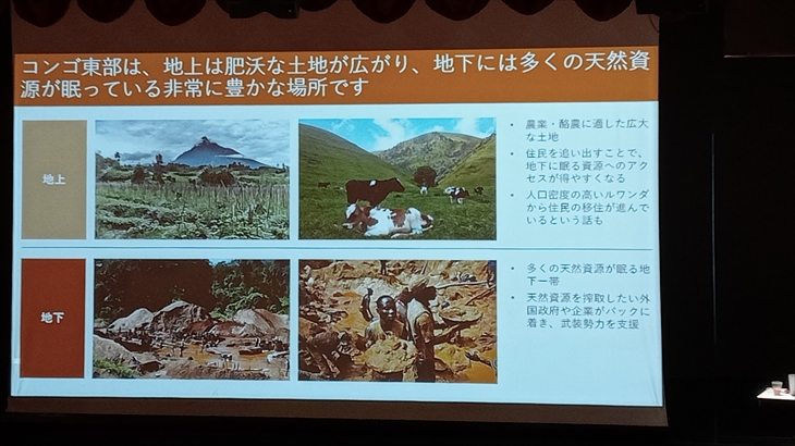 25年以上の間、戦火にさらされているコンゴ民主共和国の複雑な実情について水先案内人から説明がありました。全世界の70%以上のレアメタルを産出するコンゴは他の鉱物資源も豊富、その利権に群がる周辺国や一部の指導者、全くもって平和の道筋が見えない。
