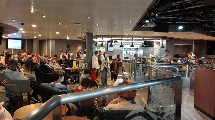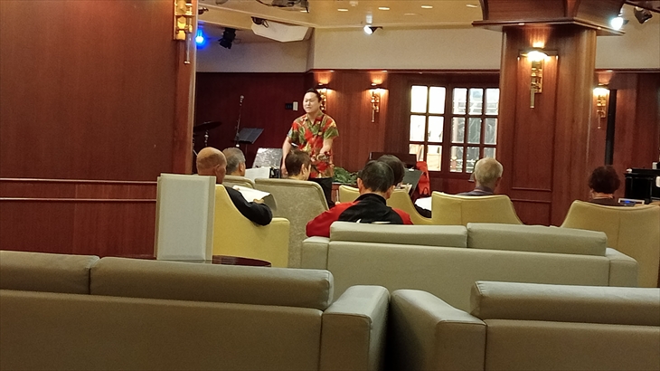 雑学とトークが上手な藤原さんの人気自主企画に参加しました。人気講座なのでいつも開催時間前に時間前に満席になってしまします。ピースボートは相部屋方式が人気の源泉、他クルーズ船はカジノ、店内販売が収益の源泉になっている、など興味深い話を聞けました。